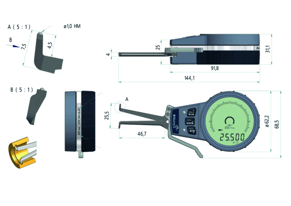 A Mitutoyo internal digital caliper gauge designed for use as a comparator, to be set up using a setting ring or micrometer. The caliper is spring loaded and makes point contact at constant measuring force.